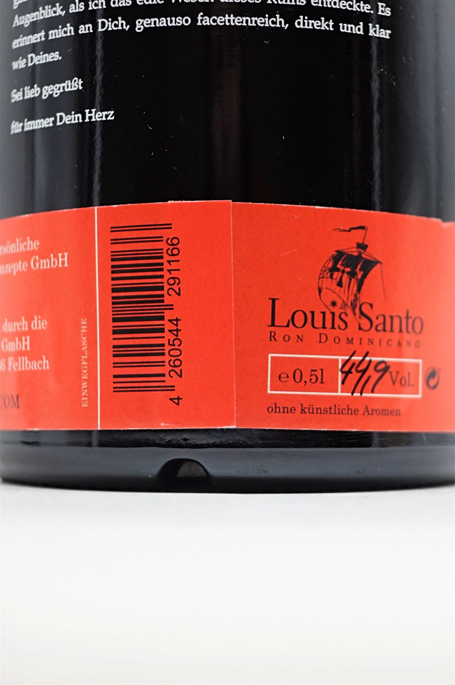 Der Rum von Louis Santo wird von Hand in kleinen Chargen in antikgrünen Vintage Flaschen abgefüllt, beschriftet und mit Naturkorken verschlossen. Außerdem wird der Rum nicht nachgesüßt und ist ohne künstliche Aromen und Zusatzstoffe.