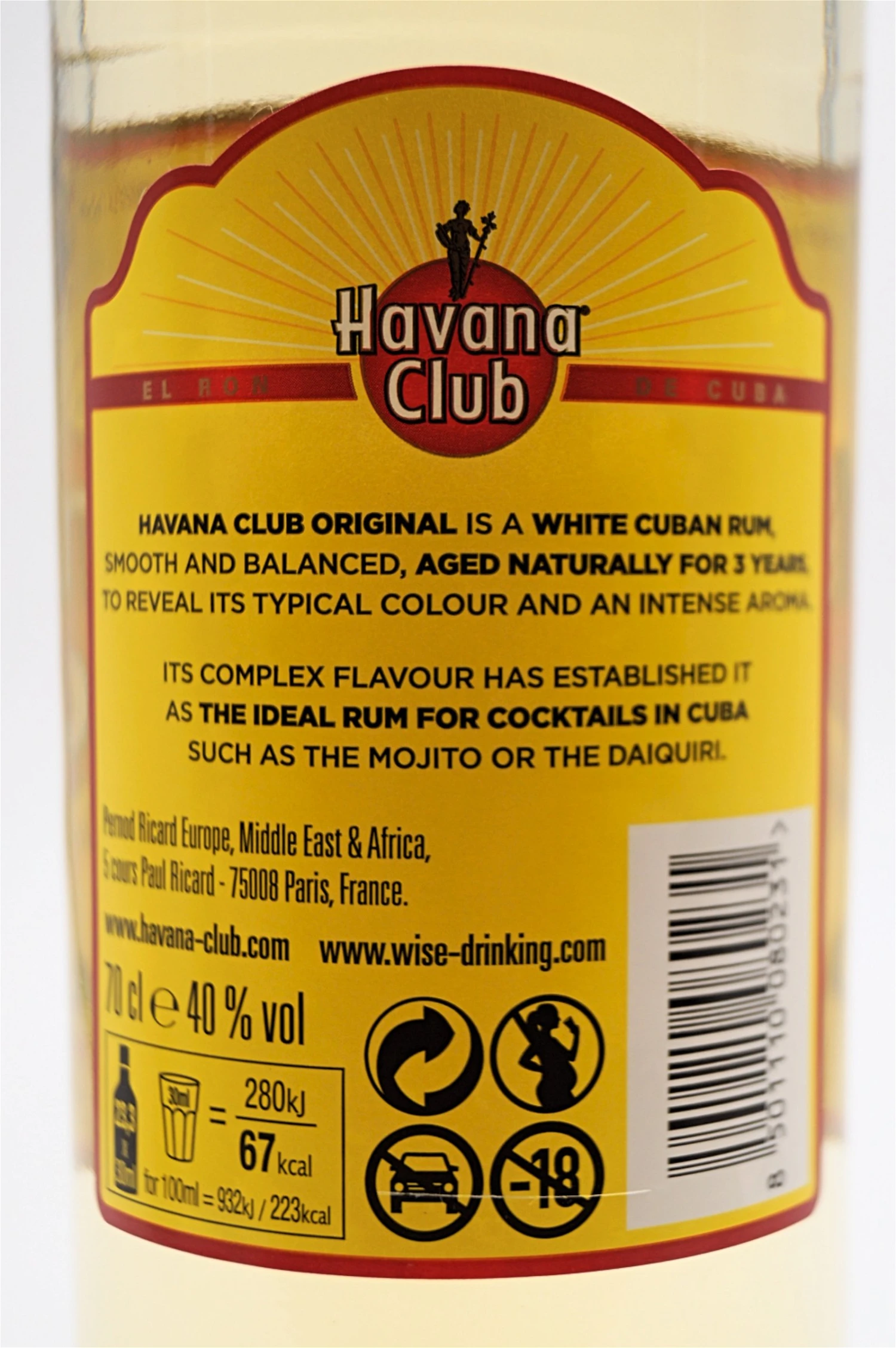 Die Frische aus der kontinuierlichen Destillation der Zuckerrohrmelasse und der Charakter aus der Reifung: eine unschlagbare Kombination! Der Havana Club 3 Años hat eine blasse, strohgoldene Farbe, die sein Alter verrät: Jeder einzelne Tropfen ist mindestens drei Jahre lang gereift. Das reichhaltige Bouquet verströmt milde Aromen mit Anklängen von Eichenholz, Melasse und Zuckerrohr. Der Geschmack ist gut ausbalanciert und komplex: süß, mild und fruchtig mit einem Anflug von Zitrusfrüchten.