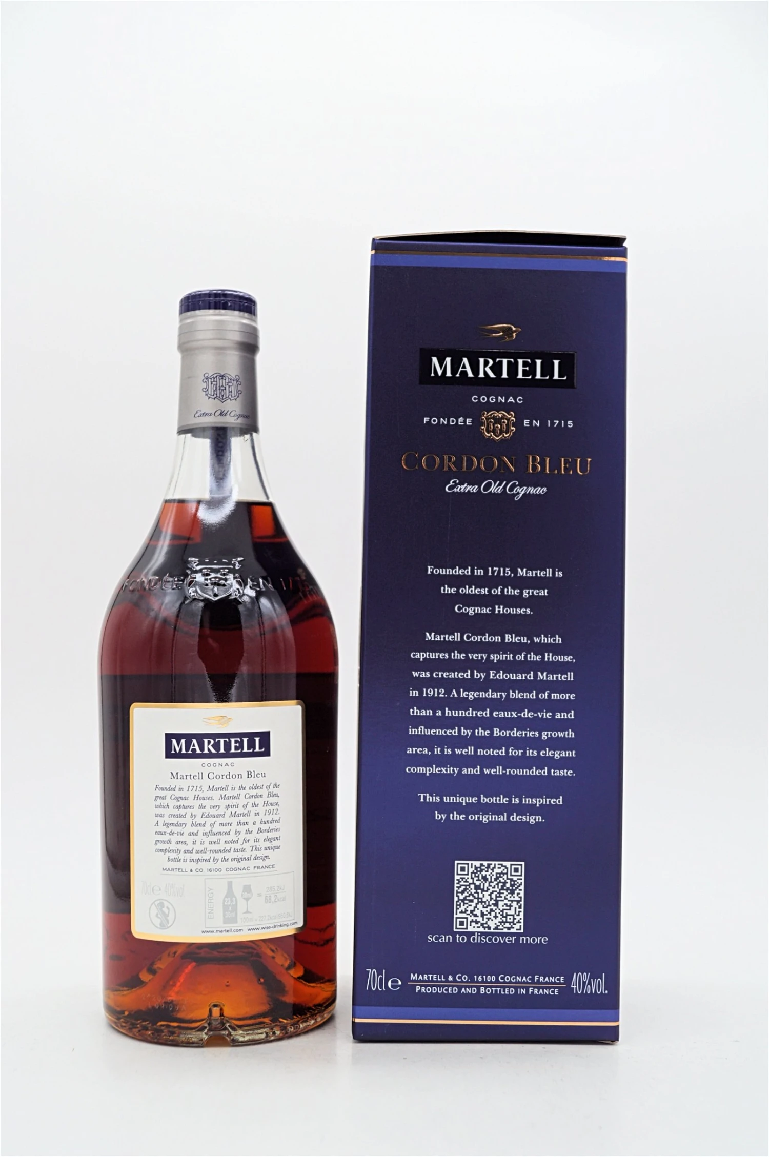 Bereits 1912 von Edouard Martell erschaffen, zählt Martell Cordon Bleu längst zu den legendärsten Cognacs der Welt. Bis zu 30 Jahre Reifezeit in Eichenholzfässern geben ihm eine einzigartige Fülle und Komplexität. Hinzu kommt die Kraft der bereits vor zwei Generationen ausgewählten Destillate von Grande und Petite Champagne sowie die Feinheit sehr alter Borderies – einige älter als 50 Jahre. Entsprechend dunkelgolden mit rötlichem Bernsteinton funkelt Martell Cordon Bleu im Cognacschwenker. In der Nase verlockende Töne von reifem Obst, zu denen sich Nuancen von getrockneter Pflaume und Apfel sowie anregende Röstaromen aus Mokka, gebrannten Mandeln und Süßgras gesellen. Gewürznoten, Orangenblüten, Honig und eine Spur Bienenwachs runden dieses facettenreiche Bouquet balsamisch ab. Der Geschmack ist unvergleichbar ausgewogen und gipfelt in einem lang anhaltenden, aromatischen und außergewöhnlich eleganten Finish.