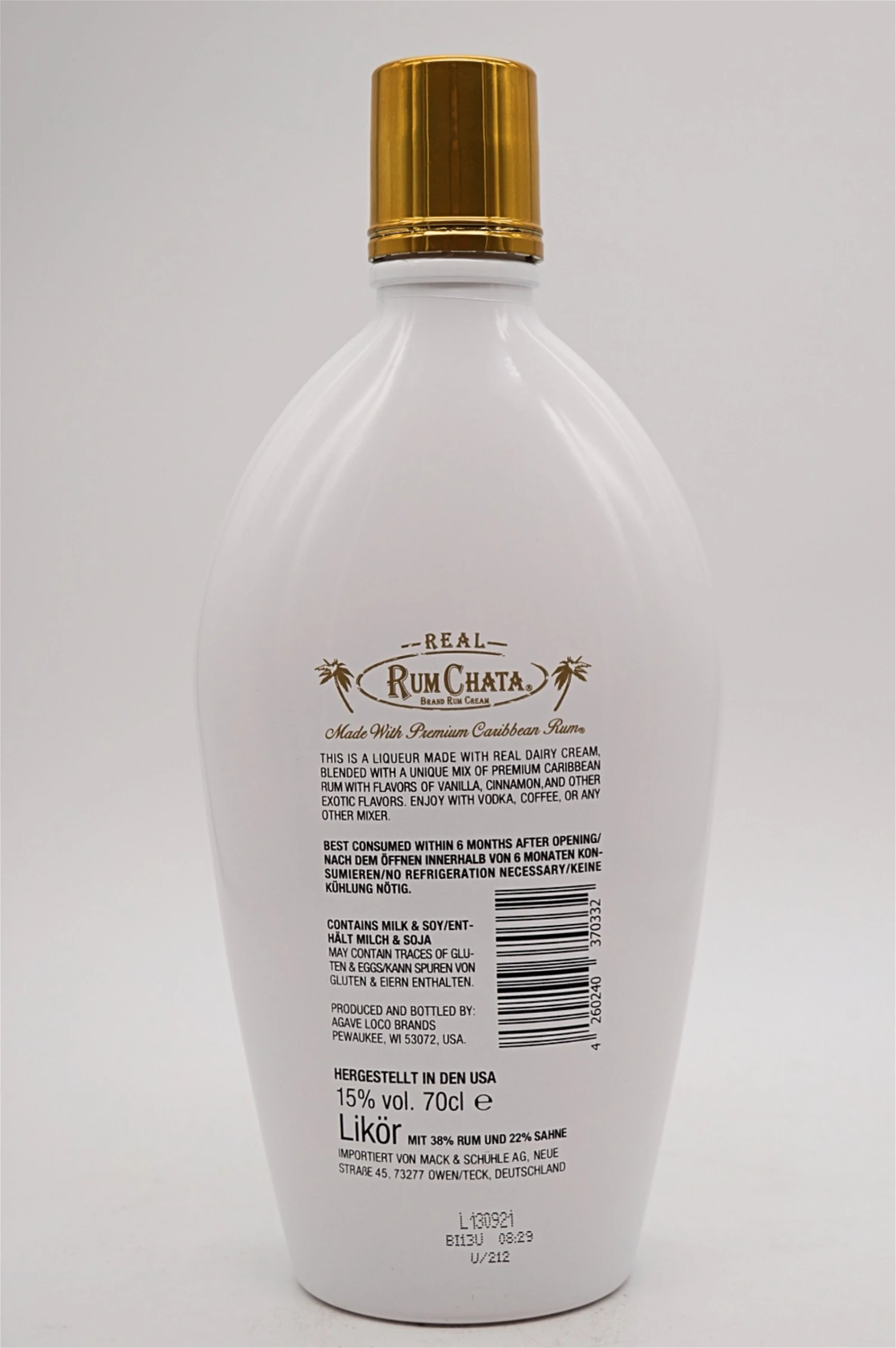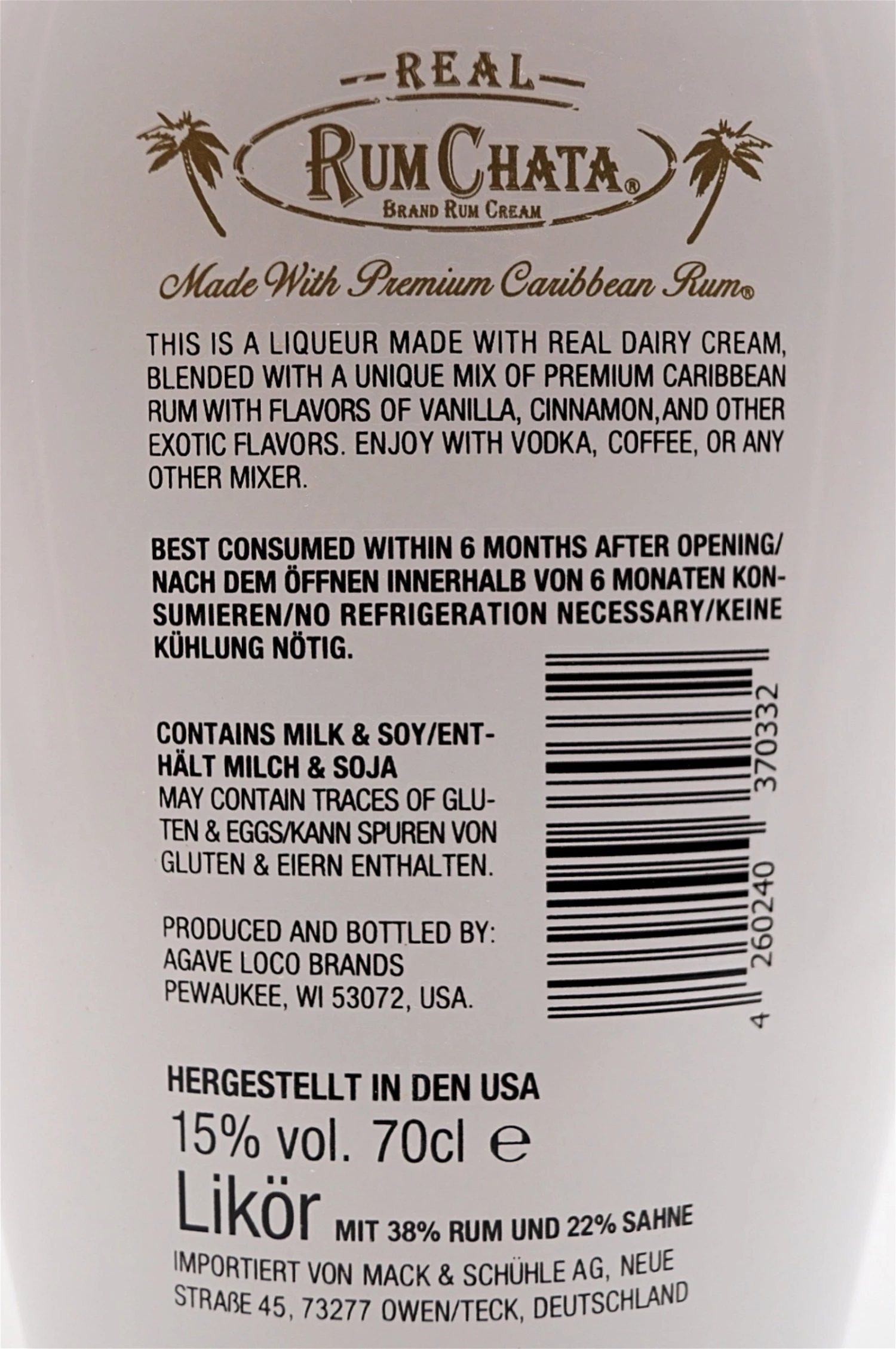Ein cremig, weißer Likör aus fünffach destilliertem karibischem Rum, bester Sahne aus Wisconsin und erlesenen Gewürzen. Am Gaumen eine cremige Süße, abgerundet durch intensive Zimt- und Gewürznoten. Rum Chata wird unter Verwendung natürlicher Inhaltsstoffe, ohne Farb- und Konservierungsstoffe hergestellt. Ein langanhaltendes seidig-samtiges Geschmackserlebnis.