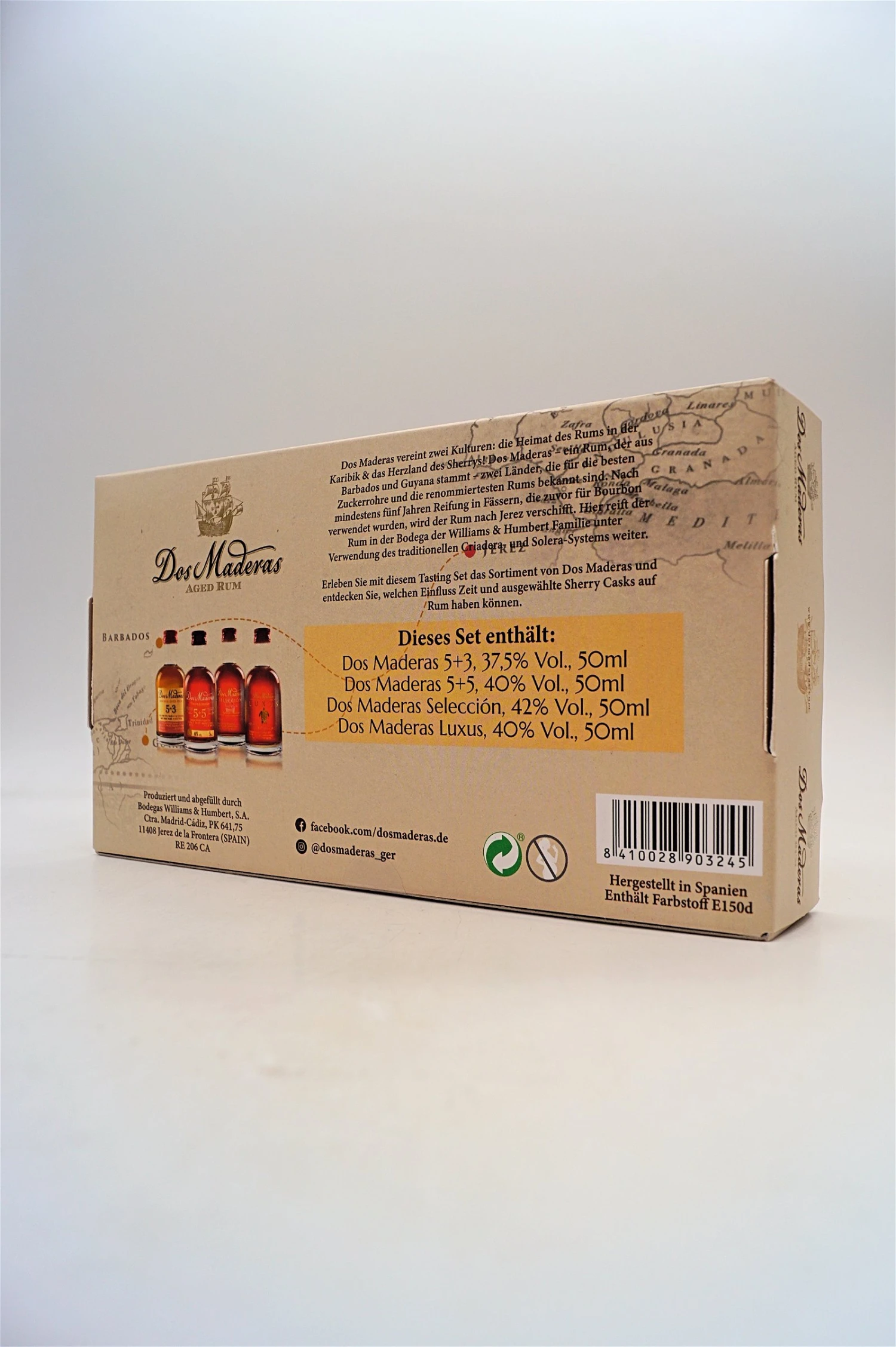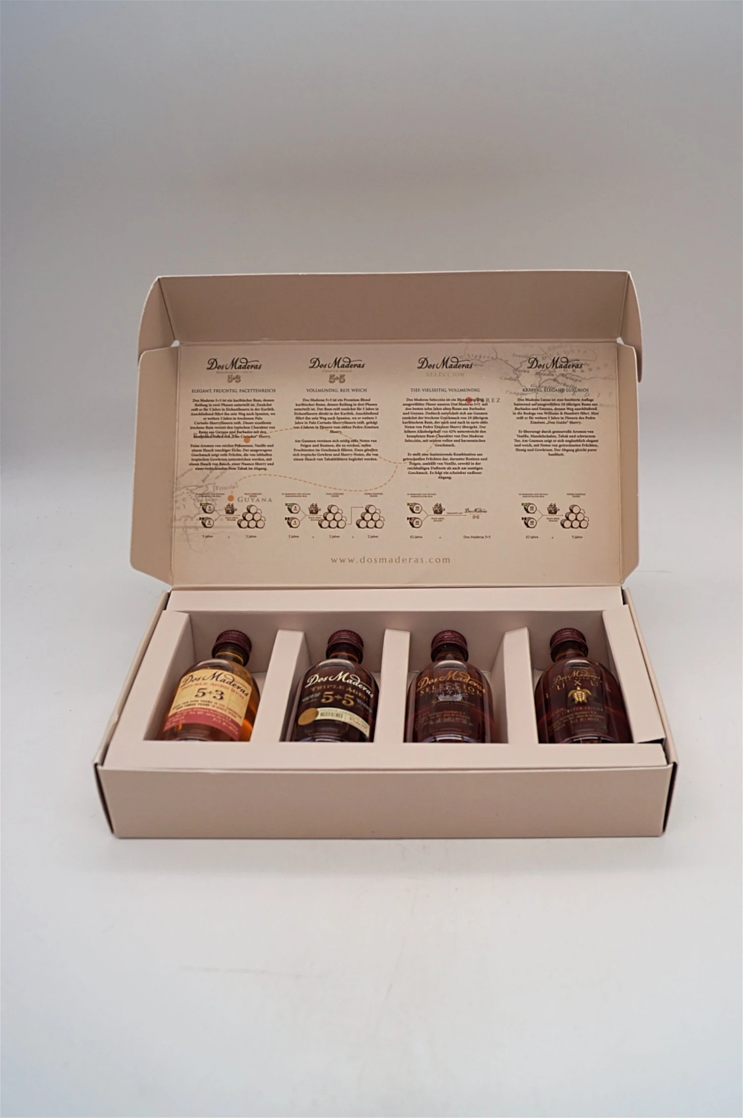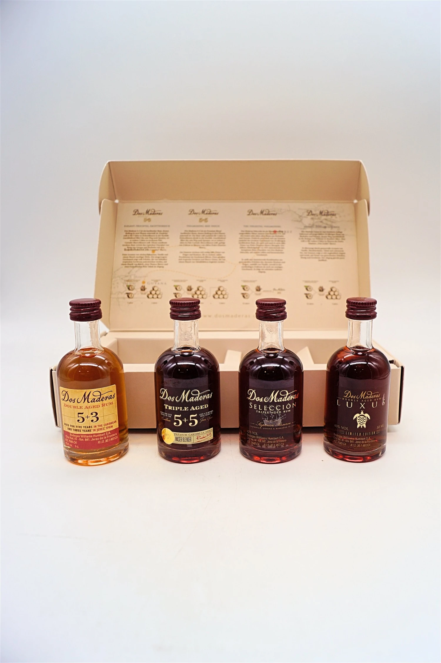 In diesem Tasting Set sind je 50 ml Dos Maderas 5+3, Dos Maderas 5+5, Dos Maderas Selección und Dos Maderas Luxus enthalten. Dies sind alle Abfüllungen der Marke und zeigt in diesem Tasting Set ihre Vielfalt im Rum.