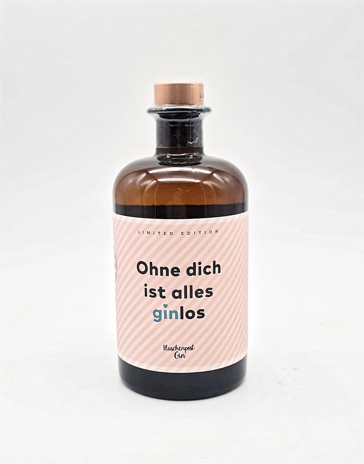 VERSCHENKE MICH: Die edle Apothekerflasche mit schickem Label-Design macht den Flaschenpost Gin zum perfekten Geschenk – egal, ob für eine(n) Freund(in) oder dich selbst.