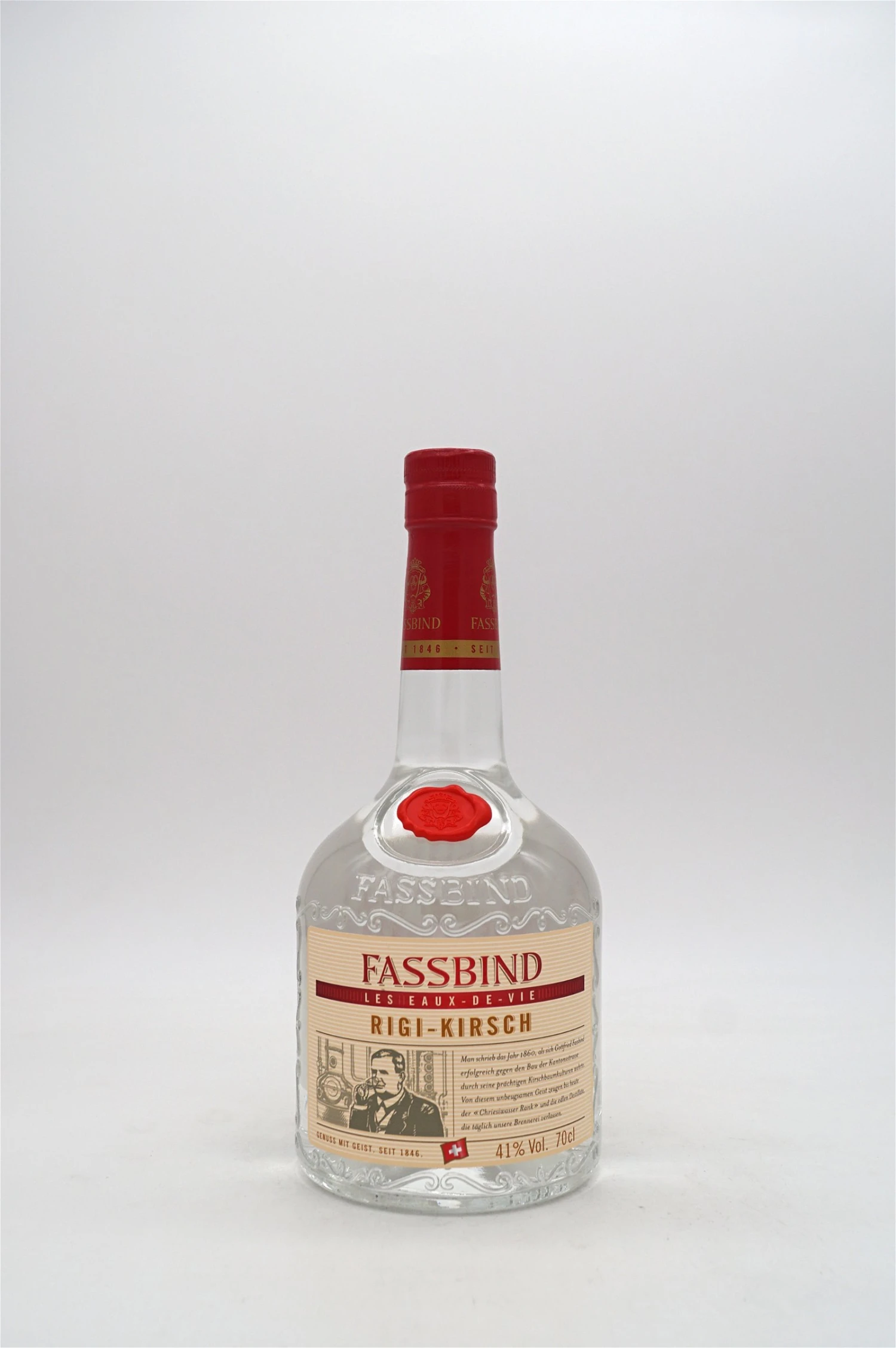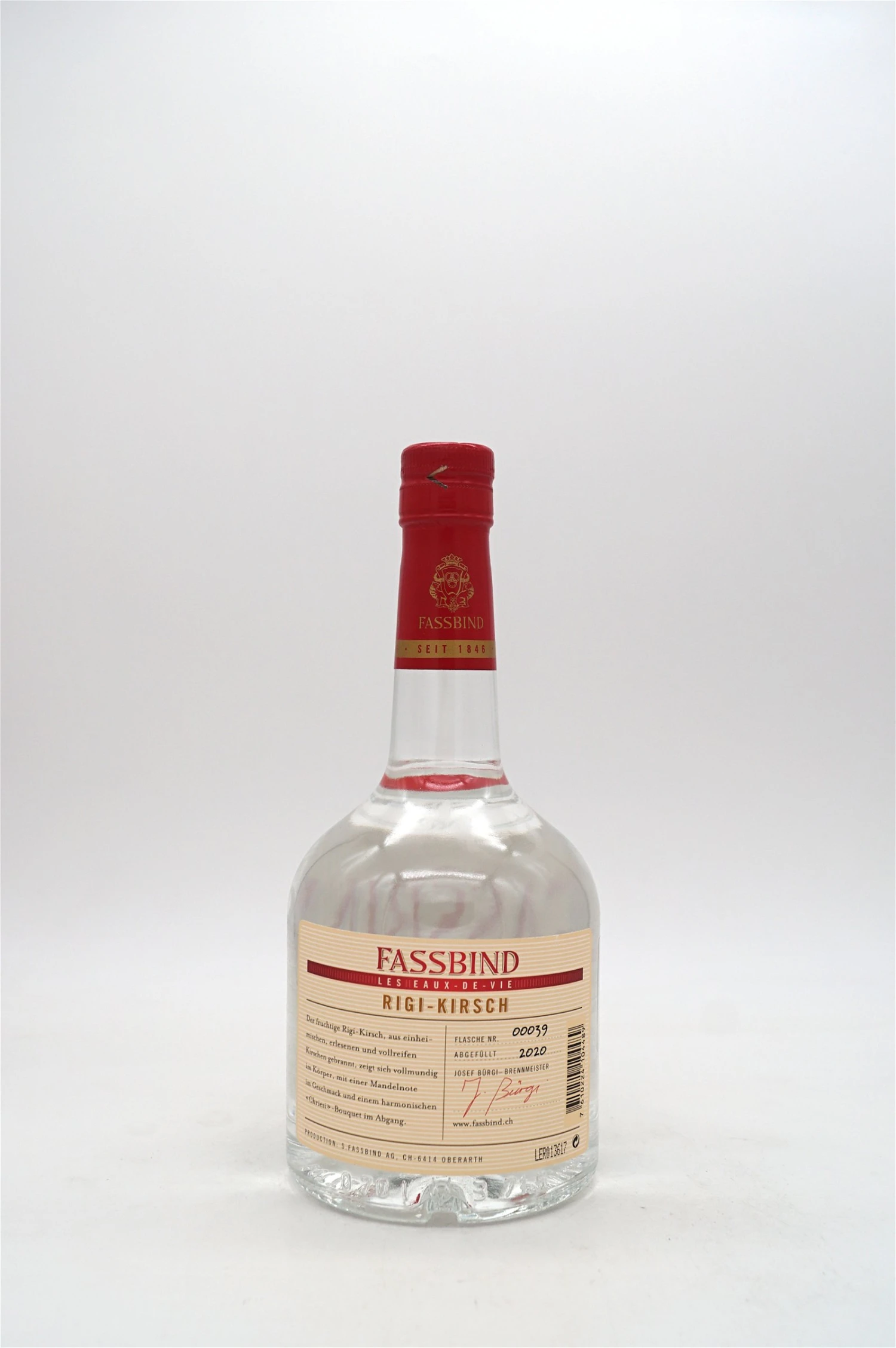 Der älteste, traditionsreichste Edelbrand aus dem Haus Fassbind wird heute nach einer neuen, vom gegenwärtigen Brennmeister eigens entwickelten Rezeptur destilliert. Die Kirschen werden nach strengen Qualitätskriterien ausgelesen und stammen ausschließlich aus der Zentralschweiz. Mit dem Gegenstromverfahren werden die Kirschen gebrannt und als Destillat mindestens 12 Monate im Keller gelagert und anschließend vom Brennmeister cuvéetiert.