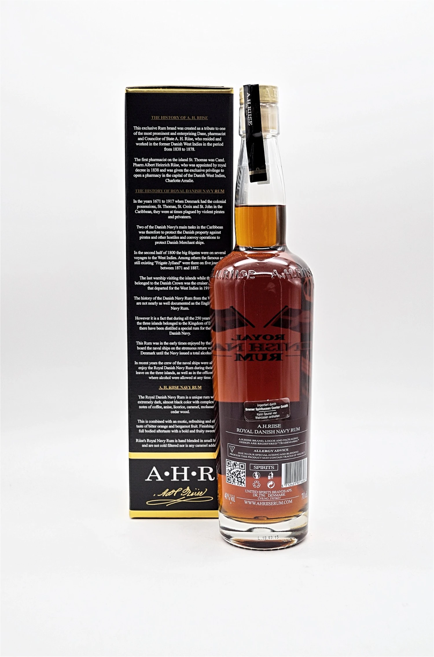 A.H. Riise Royal Danish Navy Rum 40% wurde mit Inspiration aus den Originalrezepten für Royal Navy Rum hergestellt. Die Rezepte wurden von A. H. Riise entwickelt und der Rum wurde an die Schiffe der Flotte geliefert, als diese im Hafen von Charlotte Amalie in den ehemaligen dänischen Westindischen Inseln anlegten.