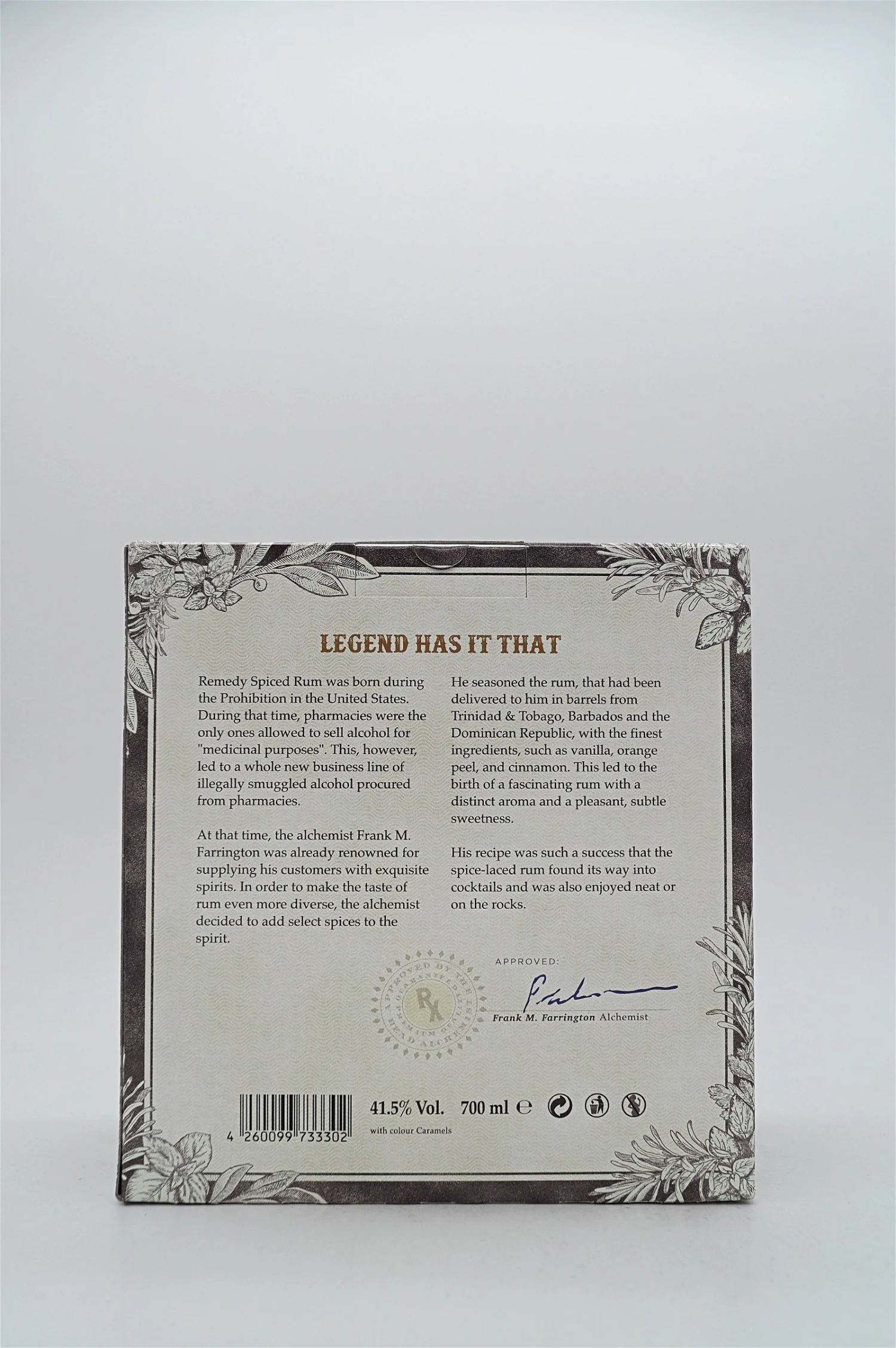 Der Legende nach entstand die Rezeptur für Remedy Spiced Rum in Farrington’s Drugstore, einer New Yorker Drogerie. Der Alchemist Frank M. Farrington war zu dieser Zeit bereits bekannt dafür, seine Kunden mit erlesenen Spirituosen zu versorgen. Um den Geschmack von Rum noch facettenreicher zu gestalten, fügte der Alchemist ihm noch ausgewählte Gewürze hinzu. So versetzte er die Rum-Fässer, die er aus Trinidad & Tobago, Barbados und der Dominikanischen Republik erhielt, mit feinsten Zutaten wie Vanille, Orangenschale und Zimt. Daraus entstand ein faszinierender Rum mit einem kräftigen Aroma und einer angenehmen, subtilen Süße.