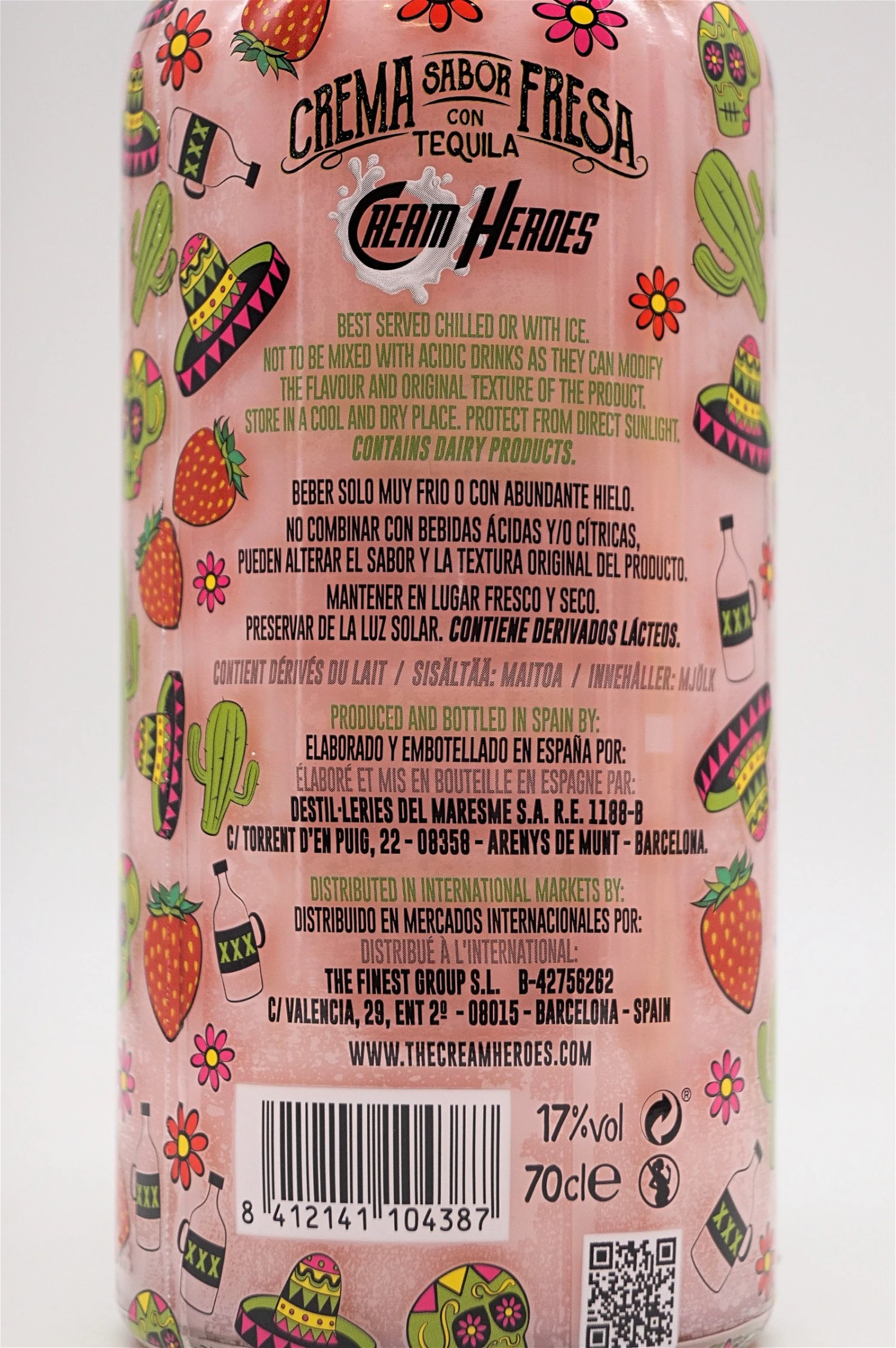 Der Cream Heroes Tequila Erdbeer Likör mit Sahne stammt aus der familiengeführten Brennerei der Destilleries Del Maresme S.A. und ist Teil der Cream Heroes Serie. Hergestellt wird der Cream Heroes Tequila Erdbeer nur aus natürlichen Zutaten, die hauptsächlich im Mittelmeerraum und in tropischen Gebieten geerntet werden. Er enthält 100 % in Mexiko hergestellten Tequila aus lokal geernteten und gerösteten Agaven-Piñas. Die Komposition aus Erdbeeren, Sahne, feinen Gewürzen und Tequila verleiht dem Creme-Likör fruchtige und erfrischende Geschmacksnoten von Erdbeeren und Sahne. Abgefüllt wird der Cream Heroes Tequila Erdbeer in einer bunt gestalteten Designerflasche.