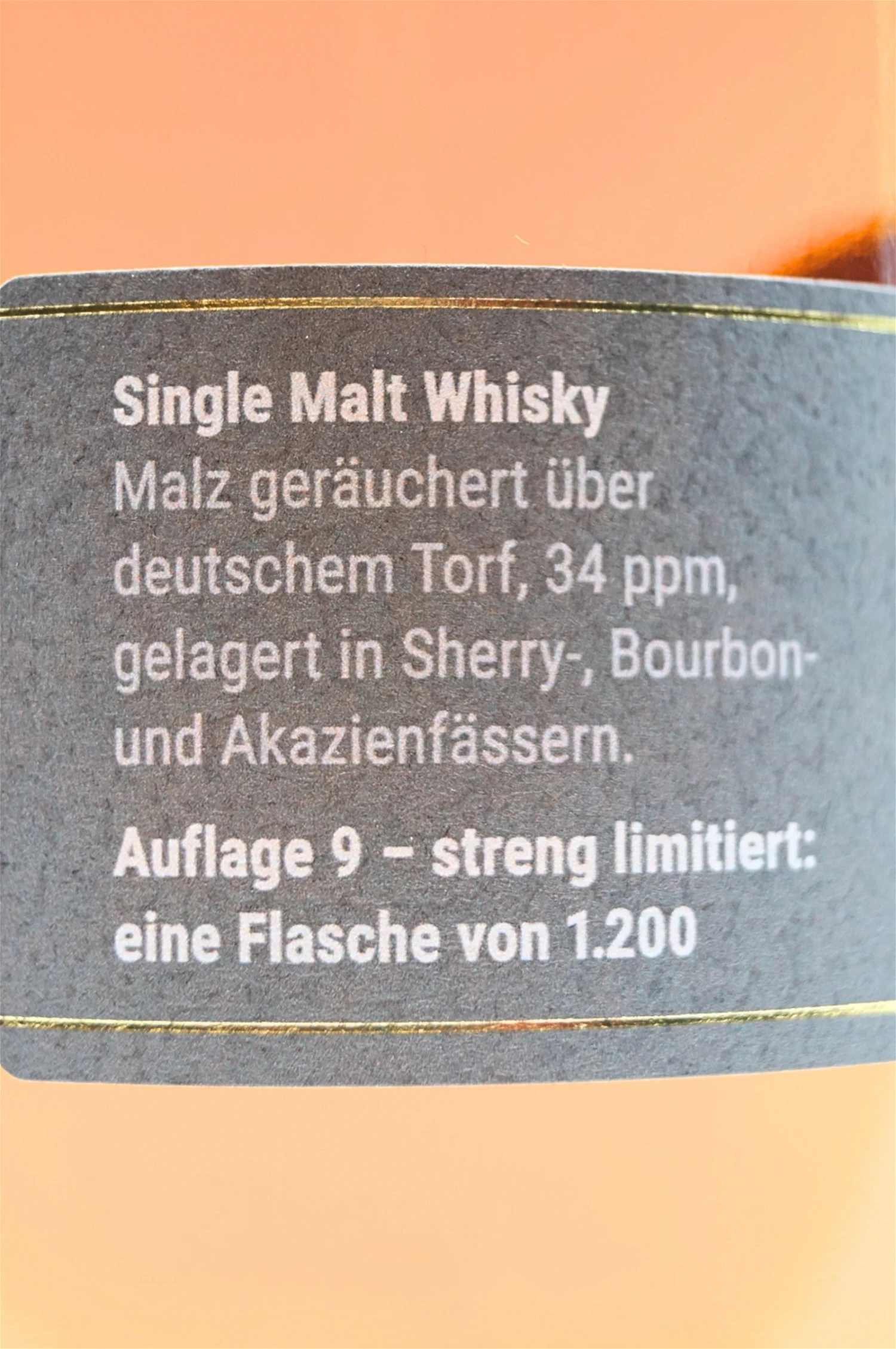 Erstmals wurde Malz mit deutschem Torf (ppm 32) geräuchert, um eine einzigartige Whisky-Spezialität zu erschaffen. In der Brennerei wird dieses Malz zu Würze verarbeitet, 7 Tage vergoren und anschließend in der Verschlussbrennerei schonend gebrannt. Das entstandene Destillat wird auf 50,2 % Alkohol verdünnt, in Bourbon-, Sherry– und Akazienfässer gefüllt und mindestens 3 Jahre gelagert.