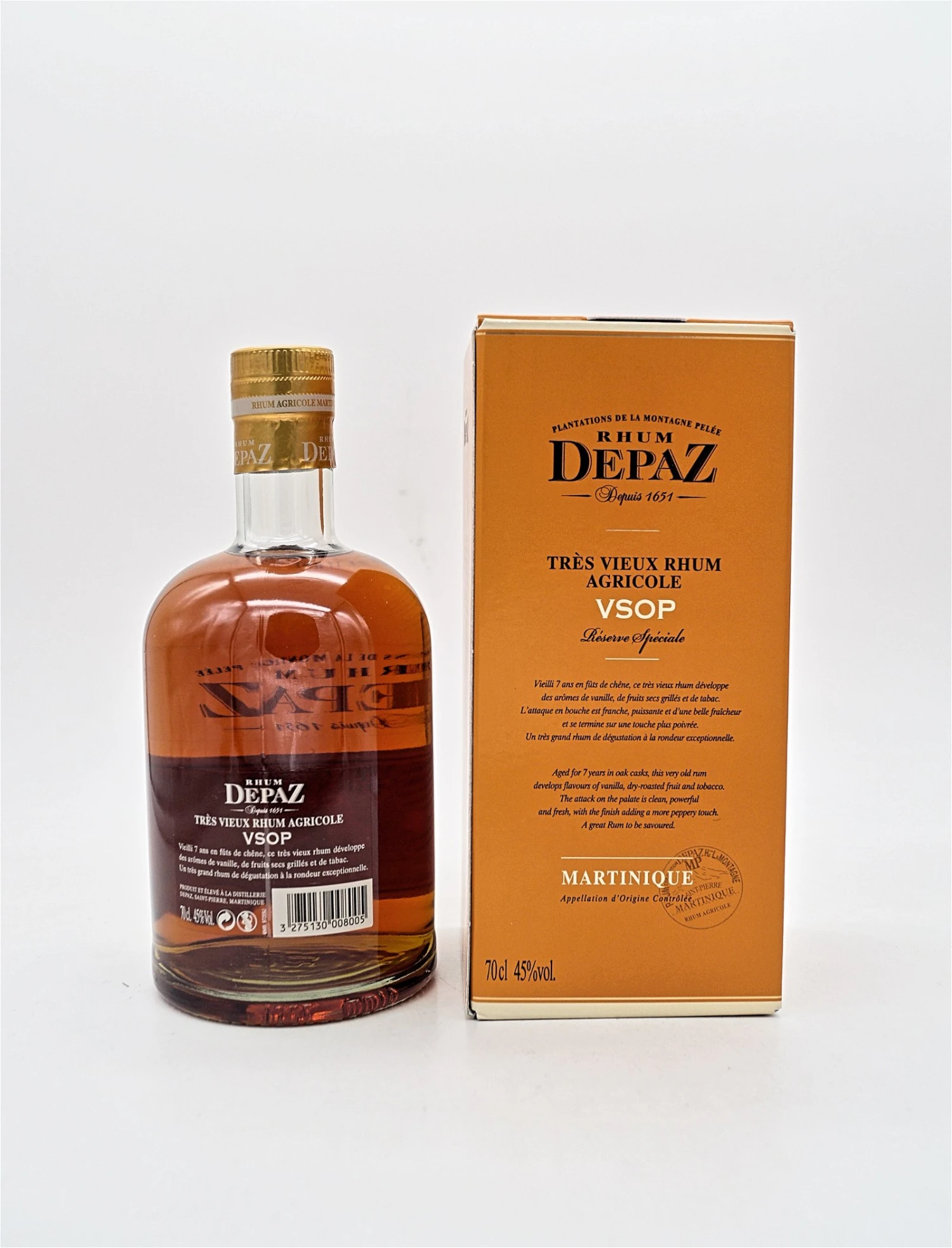Der Rhum VSOP erfreut sich dank der geografischen Lage der Habitation Depaz, am Fuße des Pelee-Vulkans, an bemerkenswerter Qualität. Der VSOP (very superior, old pale) reifte mindestens 7 Jahre in amerikanischen Eichenfässern, ehe er in 45 vol.% abgefüllt wurde. (Rhum VSOP muss nach den französischen AOC Reglements mindestens 4 Jahre gereift sein.) Depaz setzt damit seine Qualitätsstandards deutlich über die des AOC und präsentiert uns einen unglaublichen Rhum VSOP, der seines gleichen sucht.
